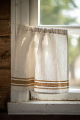Sun filters through our French Style Linen Cafe Curtain with Golden Stripes like it was made for it. Made from 100% natural linen, the warm golden woven stripes glow beautifully in natural light, bringing a soft, radiant warmth to any cottage window — a small detail that transforms the feel of an entire room. Simply thread onto a rod and enjoy.