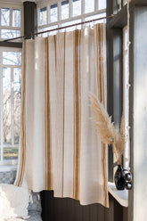 Softly structured and naturally luminous, this French-style linen curtain is woven from 100% pure linen and traced with subtle golden stripes that shift gently with the light. The warm gold threads bring a quiet richness to the fabric, while the linen’s organic texture keeps the look relaxed and authentic. Rooted in classic French interiors, it feels calm, lived-in, and quietly elegant.