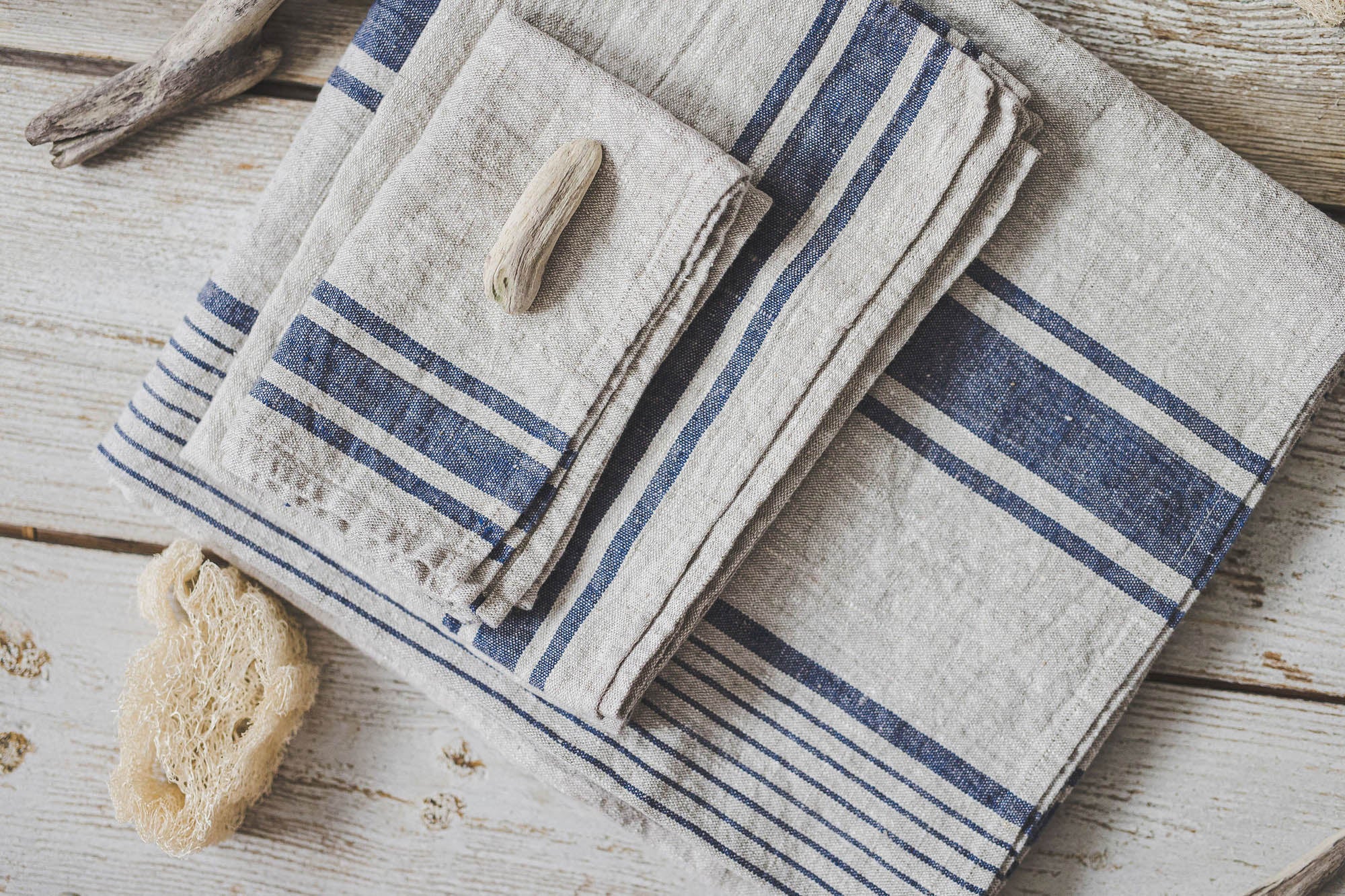 French style linen bath mat with blue stripesFrench style linen bath mat with blue stripes