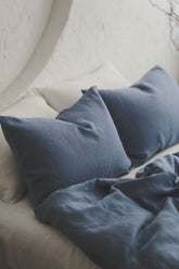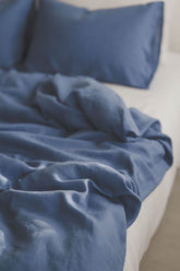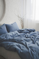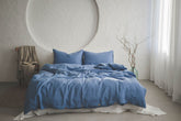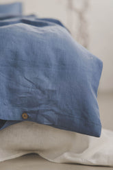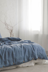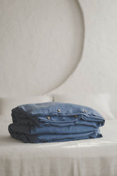 Denim blue linen duvet cover with buttons. Beautifully made of high-quality European linen with a natural texture.